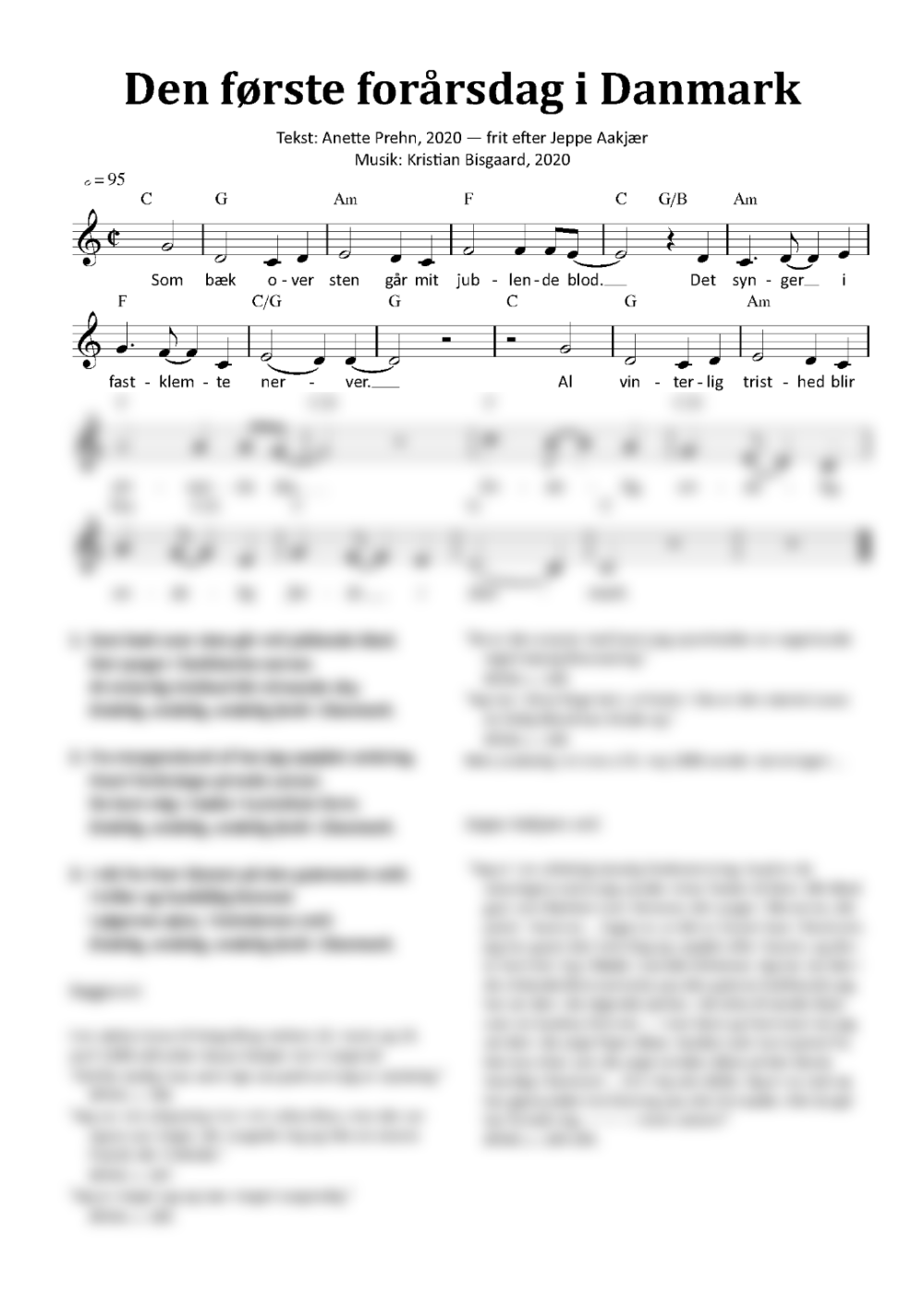 “Den første forårsdag i Danmark” er en af 21 “usungne sange” inspireret af Jeppe Aakjærs prosa. Anette Prehn har – gennem læsning af 27 bøger af og om Aakjær, og over lange corona-nedlukninger – været på opdagelse efter lyriske passager i Aakjærs for længst glemte breve, foredrag, erindringer og artikler. Melodien er komponeret af Kristian Bisgaard. Læs mere om Projekt Usungne sange om Gyldendal-bogen herom der fik 5 hjerter i Politikens anmeldelse samt om sangforedraget, som Anette Prehn og Kristian Bisgaard tilbyder.